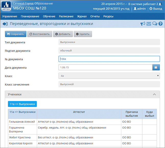 Выпускники: как правило, приказы о выпуске оформляют для учащихся 11-х (12-х) классов, но если необходимо, можно создавать документы с типом «Выпускники» также для 4-х и 9-х классов.