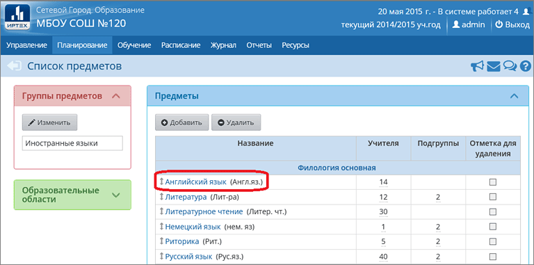 Подгруппы создаются в разделе Планирование -> Предметы. Для этого нажмите на гиперссылку с названием предмета: