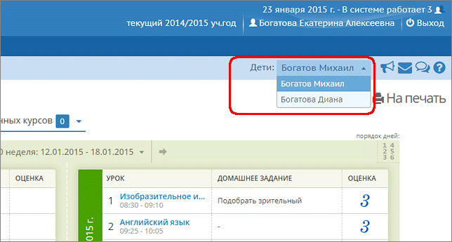 Если вы являетесь родителем двух и более учеников, то чтобы переключиться между дневниками своих детей, используйте список ваших детей в правой верхней части экрана: