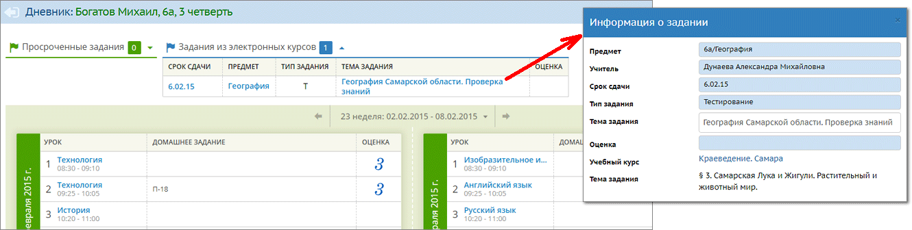 Если учитель назначил задания по электронному учебному курсу, то эти задания выводятся в блоке "Задания из электронных курсов", с возможностью перехода в учебный курс: