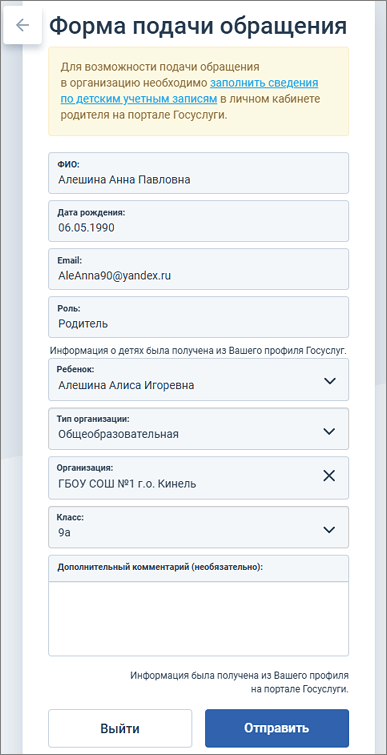 Часть полей в этой форме автоматически заполняются из профиля на портале Госуслуг (все эти поля обязательные): oФИО oДата рождения oE-mail oРоль oФИО ребёнка Пользователь заполняет вручную следующие поля: oОрганизация oКласс oДополнительный комментарий (необязательное поле). После нажатия кнопки «Отправить» - обращение сохраняется в системе и автоматически направляется сотрудникам выбранной школы.