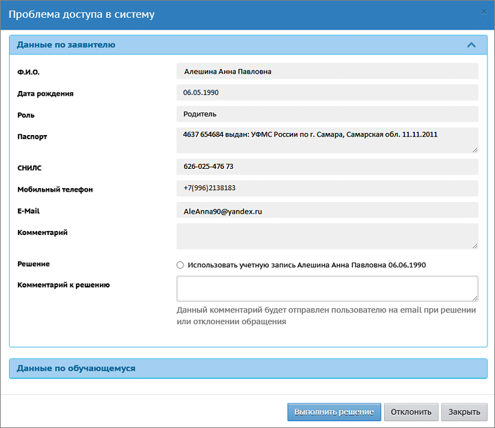 Если обращение поступило от ученика (в графе «Роль» указано «Ученик»): На этом проверка закончена: нужно нажать кнопку «Выполнить решение» (можно также ввести текстовый комментарий к решению). В результате учётная запись ученика будет привязана к детской учётной записи портала Госуслуг.