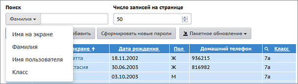 Быстрый поиск учащихся Чтобы быстро найти нужного ученика, в графе "Поиск" введите первые буквы фамилии, и список будет сразу ограничен нужными учениками. Кроме фамилии, можно быстро искать по другим полям, например, по имени пользователя (т.е. логину):